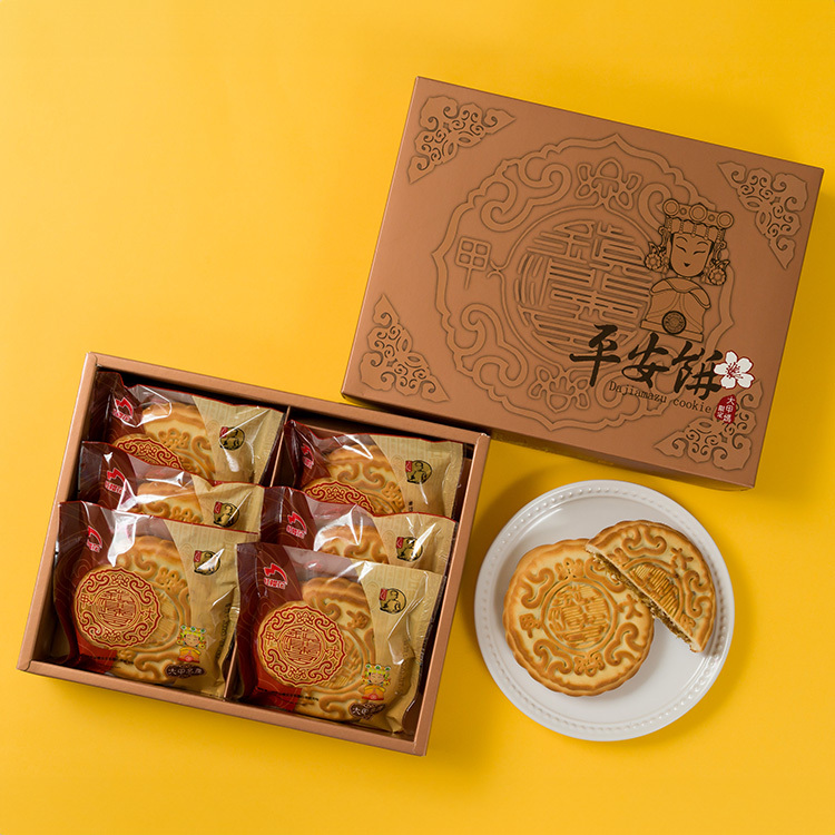 餅模烙印著《大甲鎮瀾宮》全台獨家唯一真正大甲鎮瀾宮授權;餡材使用台灣在地優質紅豆製成甜度較低的純紅豆內餡,搭配Q彈的麻糬, 創新用蜂蜜餅皮包裹日式口味的香甜内餡,有別於傳統大餅。 甜不膩口,餅皮飄著蜂蜜香,讓妳品嘗到不同以往台灣傳統糕餅的新食感。