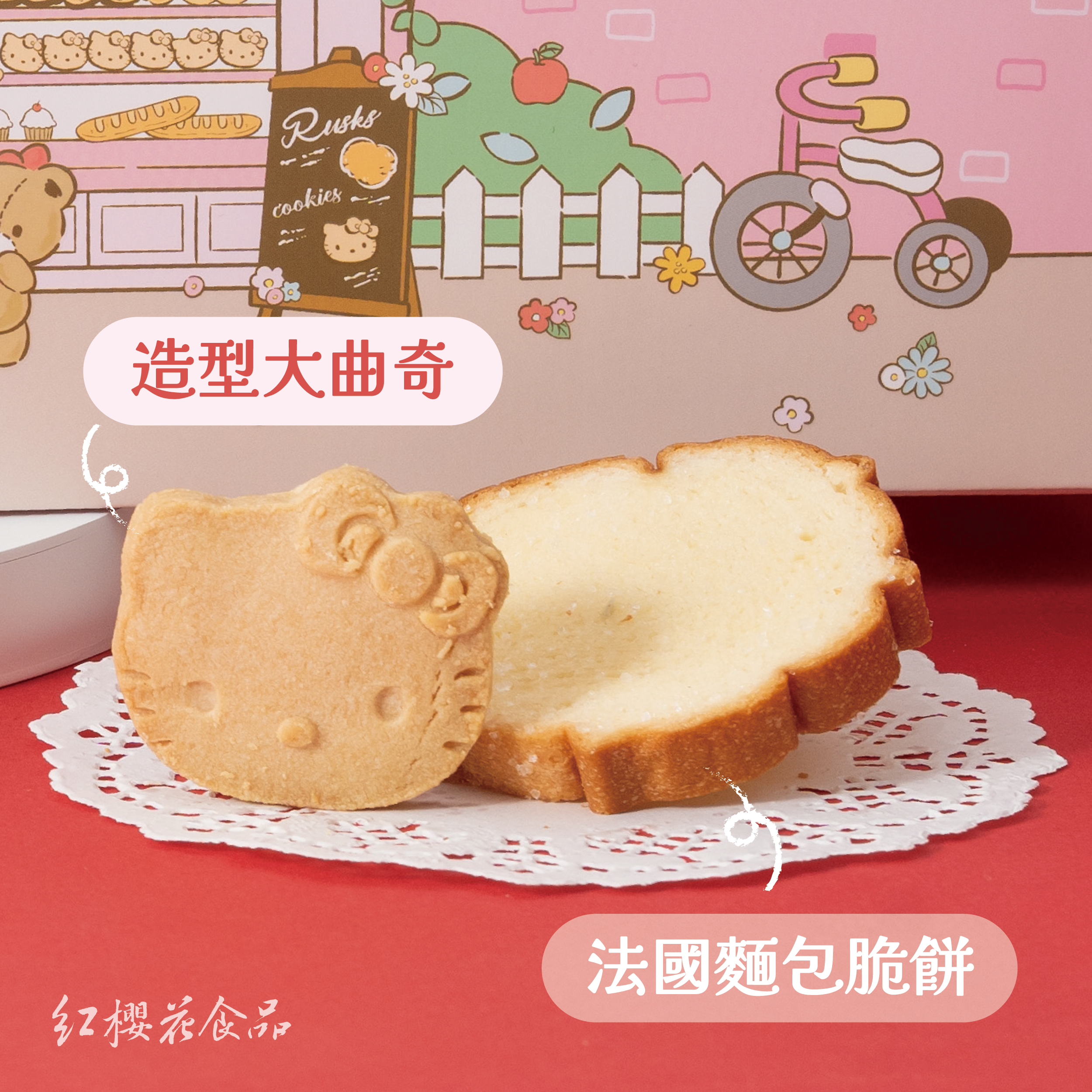 源自厚實口感的法國長棍麵包,厚實香脆,搭配顆粒狀砂糖口感,品味迴盪在空氣中的奶油香,涮嘴好吃到停不下來,讓味蕾與心靈共同沉浸在法國獨有的浪漫氛圍中。紅櫻花法國麵包脆餅經過改良,適溫慢烤,非油炸,輕烘焙,大小適中的切片,清爽酥脆的口感中帶著香氣四溢的風味,讓人更優雅且方便的品嚐法式美味。Hello Kitty造型奶油曲奇餅乾,採用法國諾曼第奶油,濃郁的餅乾香氣滿足您的味蕾,大人小孩都喜愛,是辦公室團購零食、團購美食的常勝軍,也是年節送禮的優質選擇。