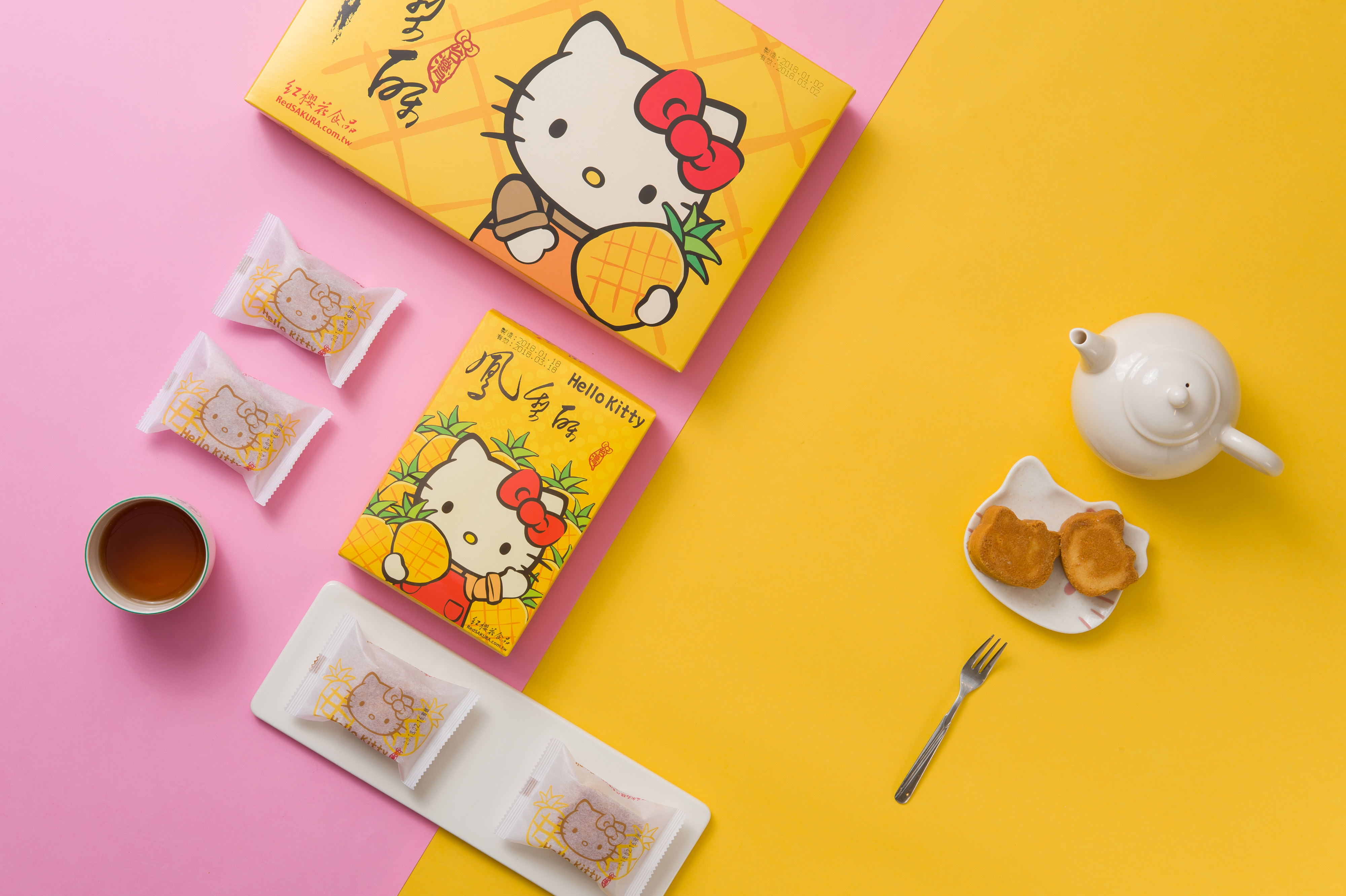有別以往方方正正的鳳梨酥,紅櫻花獲得三麗鷗授權Hello Kitty,推出超可愛Kitty造型的鳳梨酥,特殊的濃郁果香,果實小、甜度高、酸度低,原始的酸甜果香和纖維,就算成本再高紅櫻花也要使用這麼好的食材,堅持採用純正100%鳳梨熬煮調製而成的鳳梨酥內餡,不添加防腐劑,誠意滿滿的餡料,讓你可以直接品嚐到鳳梨纖維的濃郁果香,健康低糖,加上極佳的Q軟口感,微酸微甜,配上嚴選紐西蘭奶油細心桿製而成的餅皮,外酥內軟,讓你不只吃得美味,看得更開心。