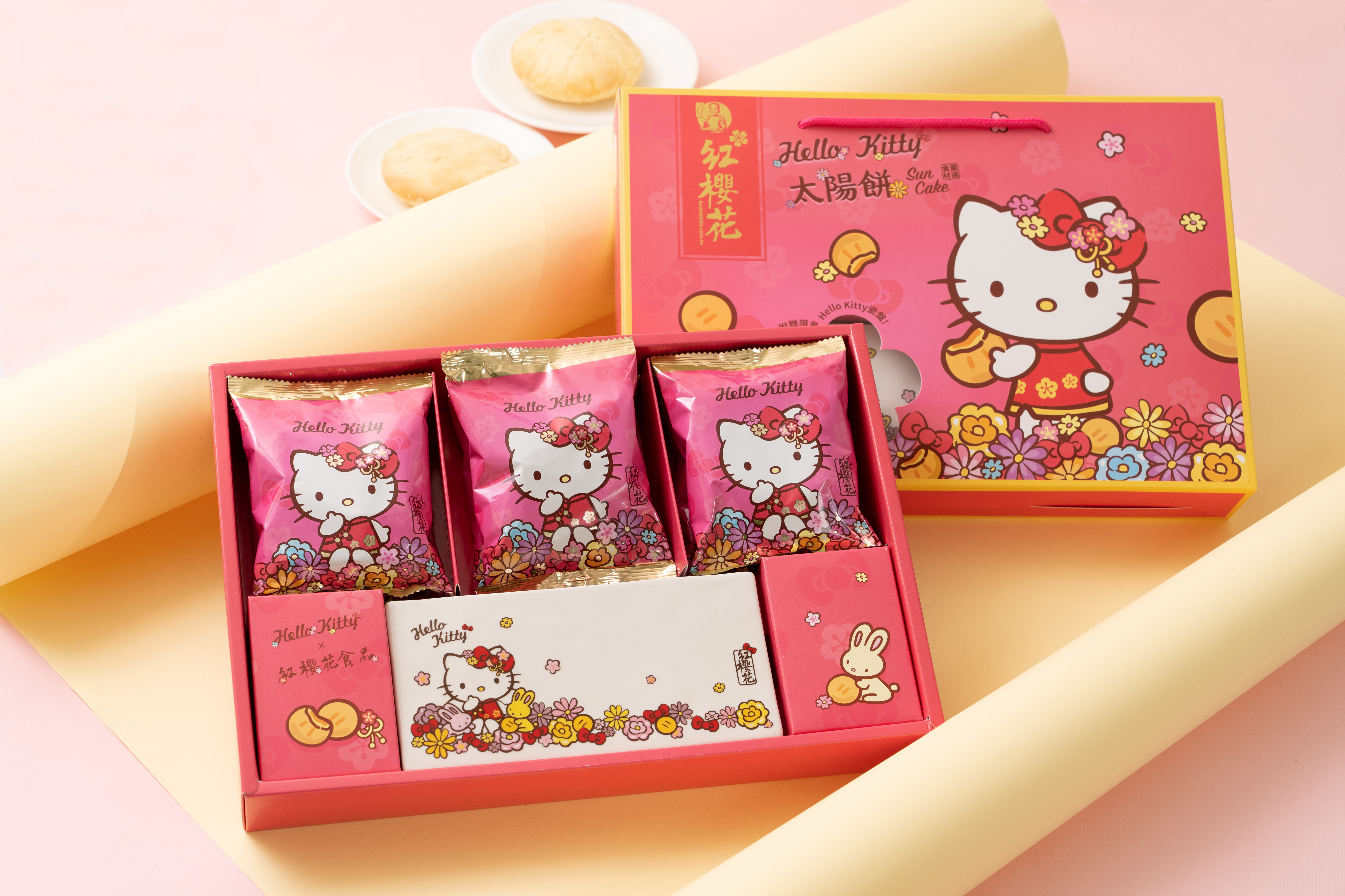 紅櫻花Hello Kitty太陽餅,遵從古法,每片太陽餅皆以手工製作,將純麥芽糖細火慢熬, 反覆的將麥芽餡熬的又甜又香,質軟而不黏牙,才能將麥芽餡做的透心軟,並保留最原始的麥芽香,同時改良了以往傳統的太陽餅餅皮未吃先碎的缺點,用手工桿出層層酥薄的餅皮,酥而不碎,裹著濃而不膩的麥芽餡,是歷久不變的美味,讓人忍不住一口接一口。