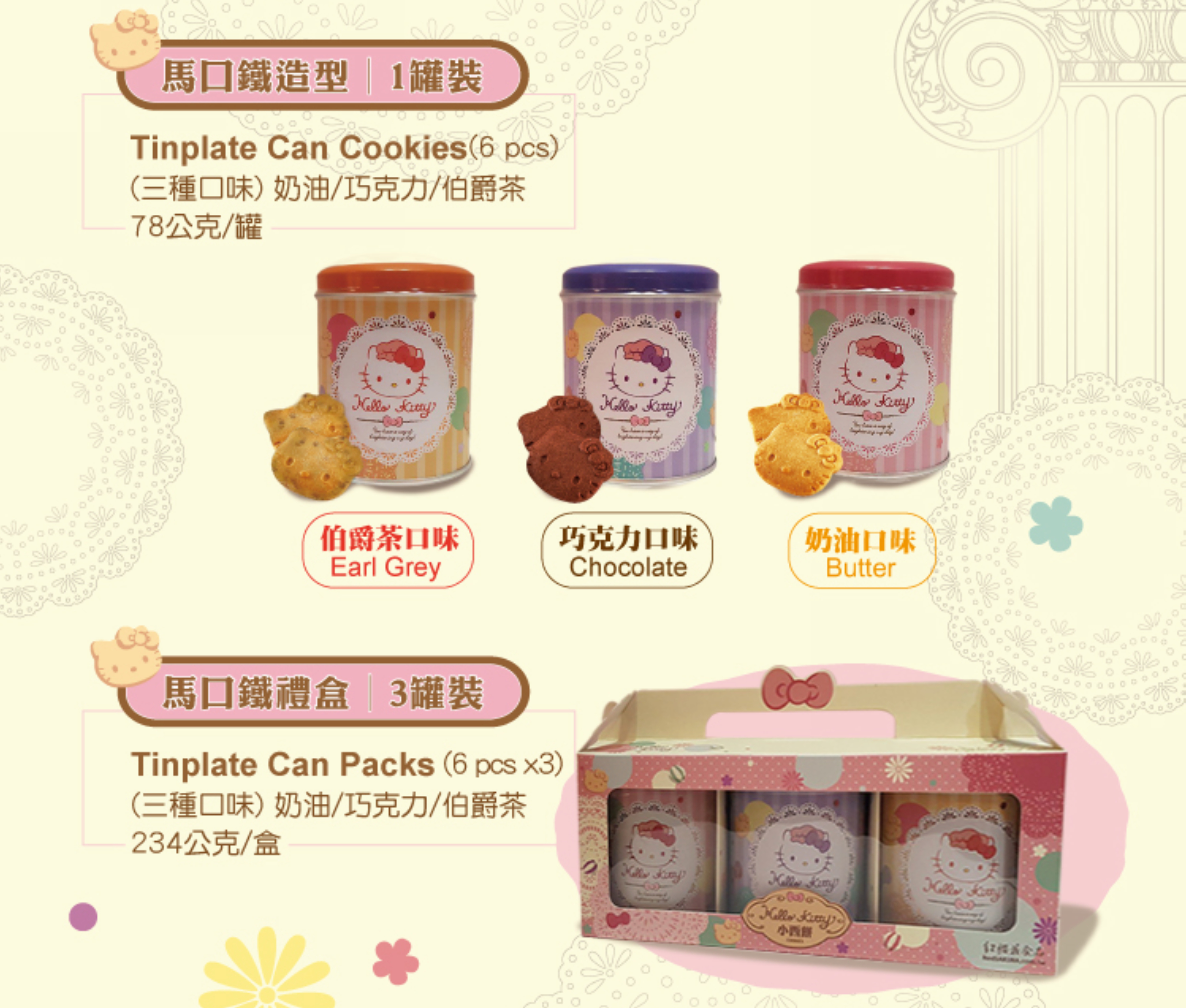 擁有香醇淡雅的奶油口味,是曲奇餅乾最經典不敗的口味,不管是大人、小孩、還是長輩,通通一次滿足。即使成本再高,紅櫻花也堅持使用好的食材製作Hello Kitty造型曲奇小餅乾,擁有超可愛Hello Kitty造型的曲奇小餅乾,讓人忍不住一口接一口,不只是上班族最愛團購的小零嘴、孩童下課時的休閒點心,也是午茶分享時光的最佳茶點喔。
