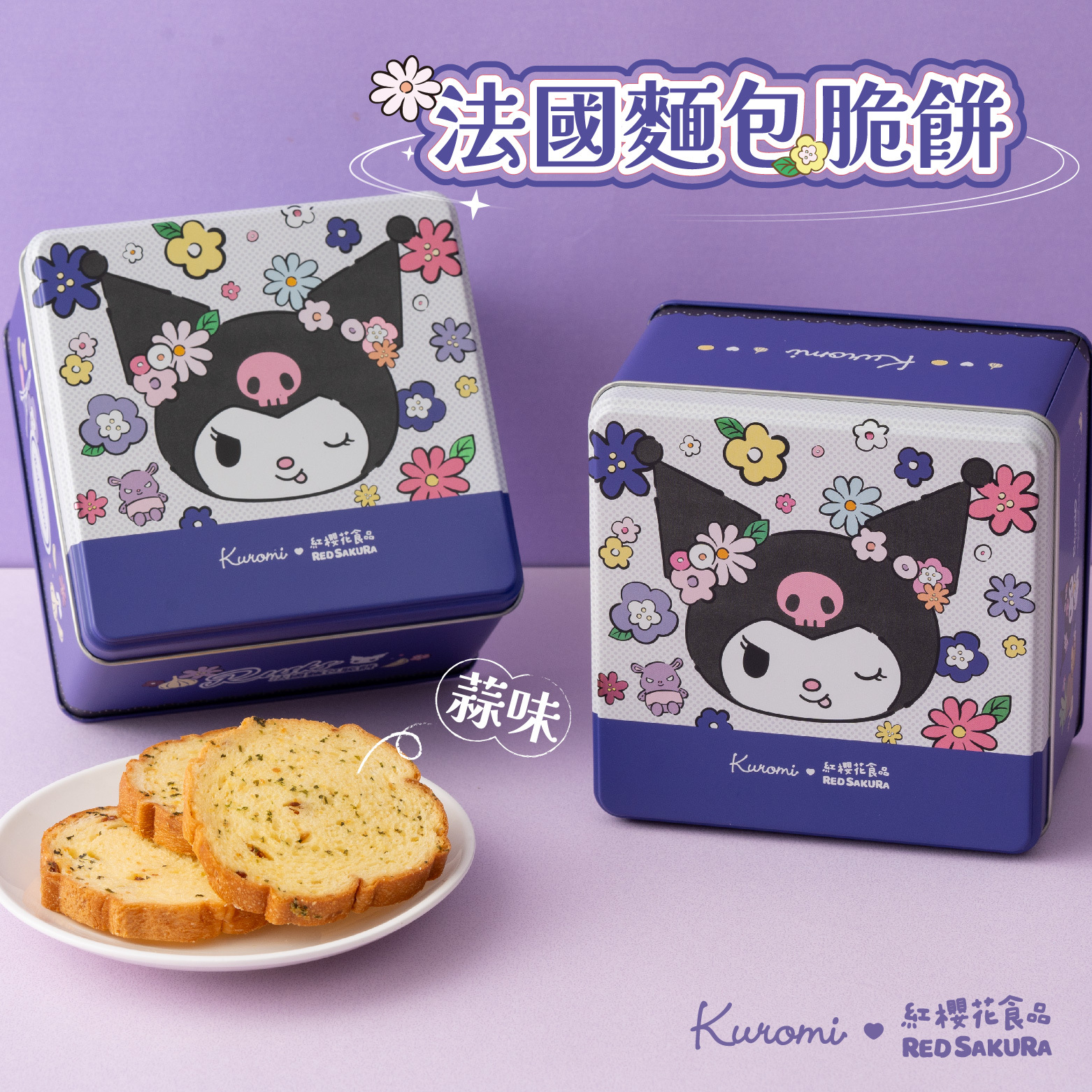 有了紅櫻花,不用飛到法國也能享受法式浪漫囉。源自厚實口感的法國長棍麵包,厚實香脆,搭配顆粒狀砂糖口感,品味迴盪在空氣中的脆餅香氣,涮嘴好吃到停不下來,讓味蕾與心靈共同沉浸在法國獨有的浪漫氛圍中。紅櫻花 X Kuromi法國麵包脆餅經過改良,適溫慢烤,非油炸,輕烘焙,大小適中的切片,清爽酥脆的口感中帶著香氣四溢的香蒜風味,讓人更優雅且方便的品嚐法式美味。超可愛的Kuromi馬口鐵禮盒包裝,不只是上班族最愛團購的小零嘴,也是午茶分享時光最佳的茶點、年節送禮的最佳選擇。