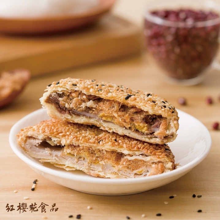 香酥芝麻餅皮,包裹台灣紅豆、黑豬肉肉脯、Q彈麻糬與特級鴨蛋