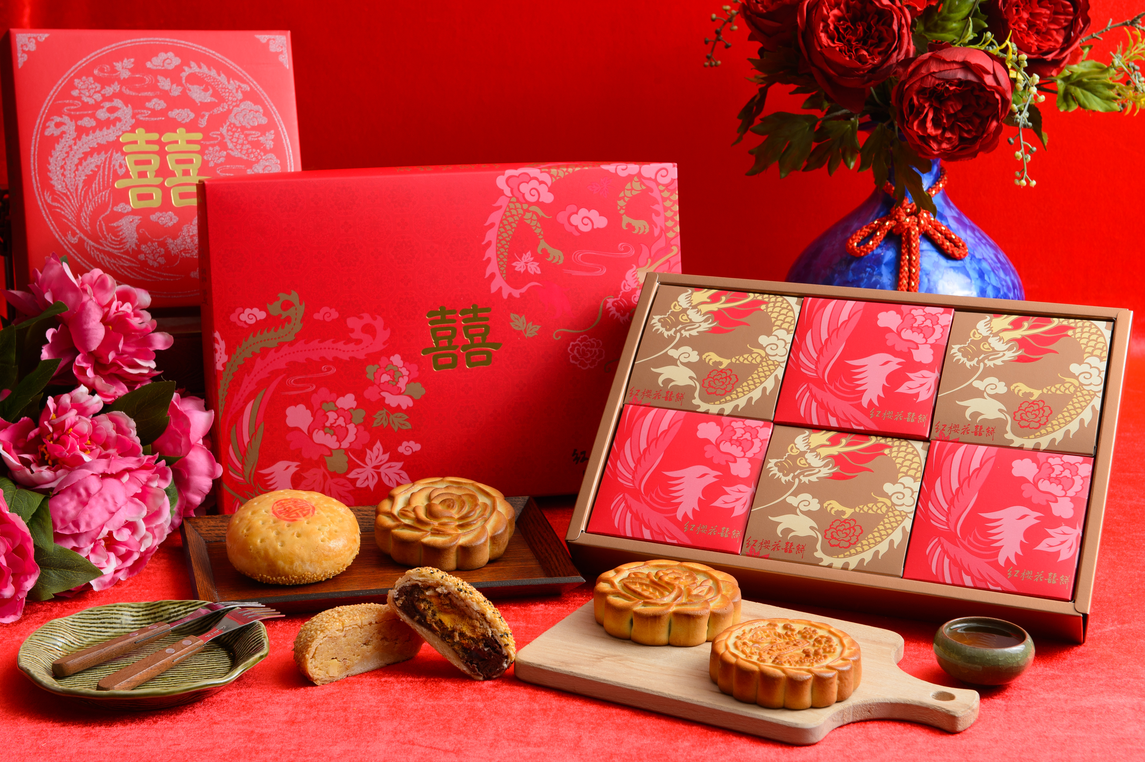 除了單入包裝的【幸福囍餅】紅櫻花龍鳳囍餅三兩八喜餅,還有六款可自由搭配的禮盒組喔