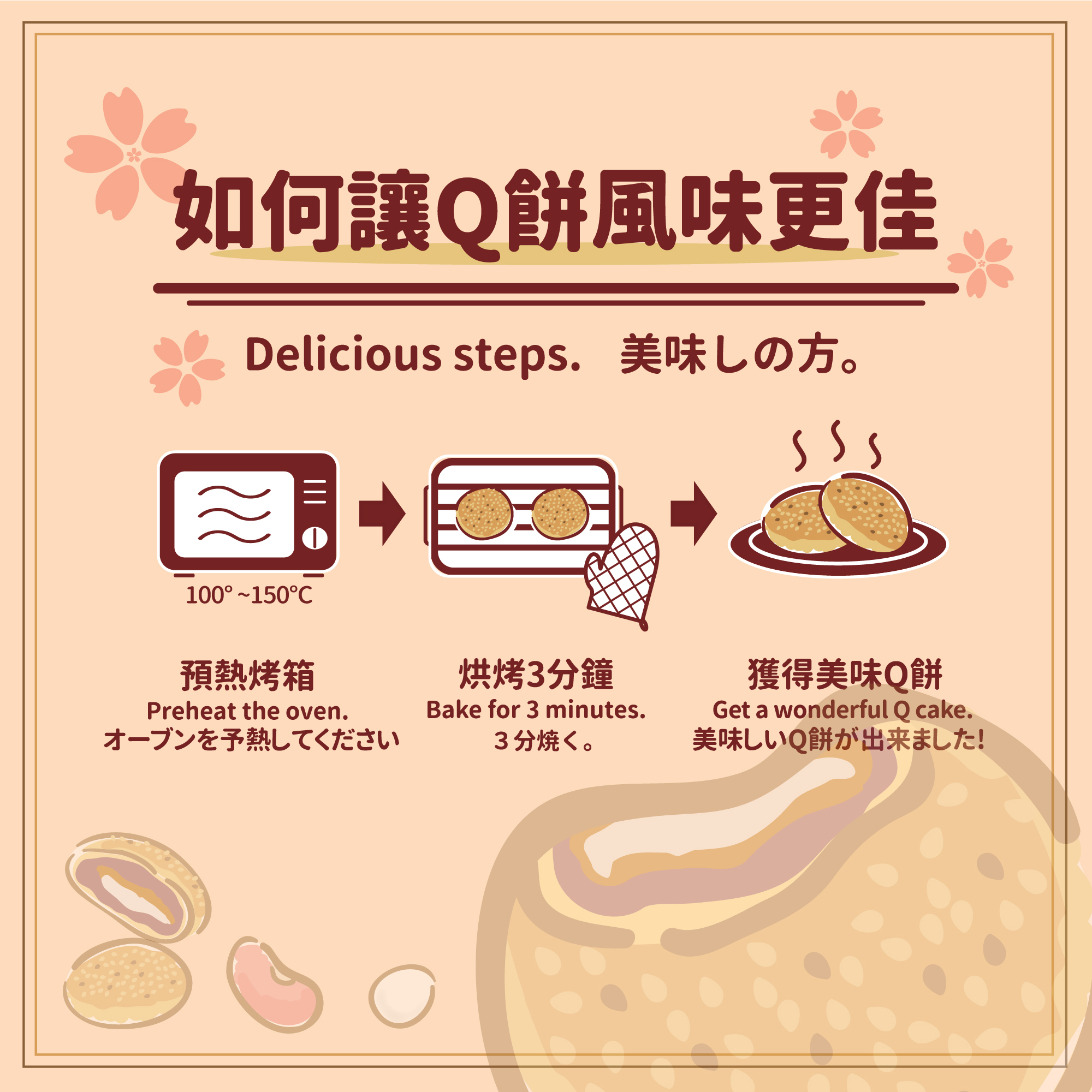 【台灣Q餅美味的秘訣】食用紅櫻花台灣Q餅前,可用烤箱烘烤加熱,烤過後的紅豆Q餅更加香酥美味
