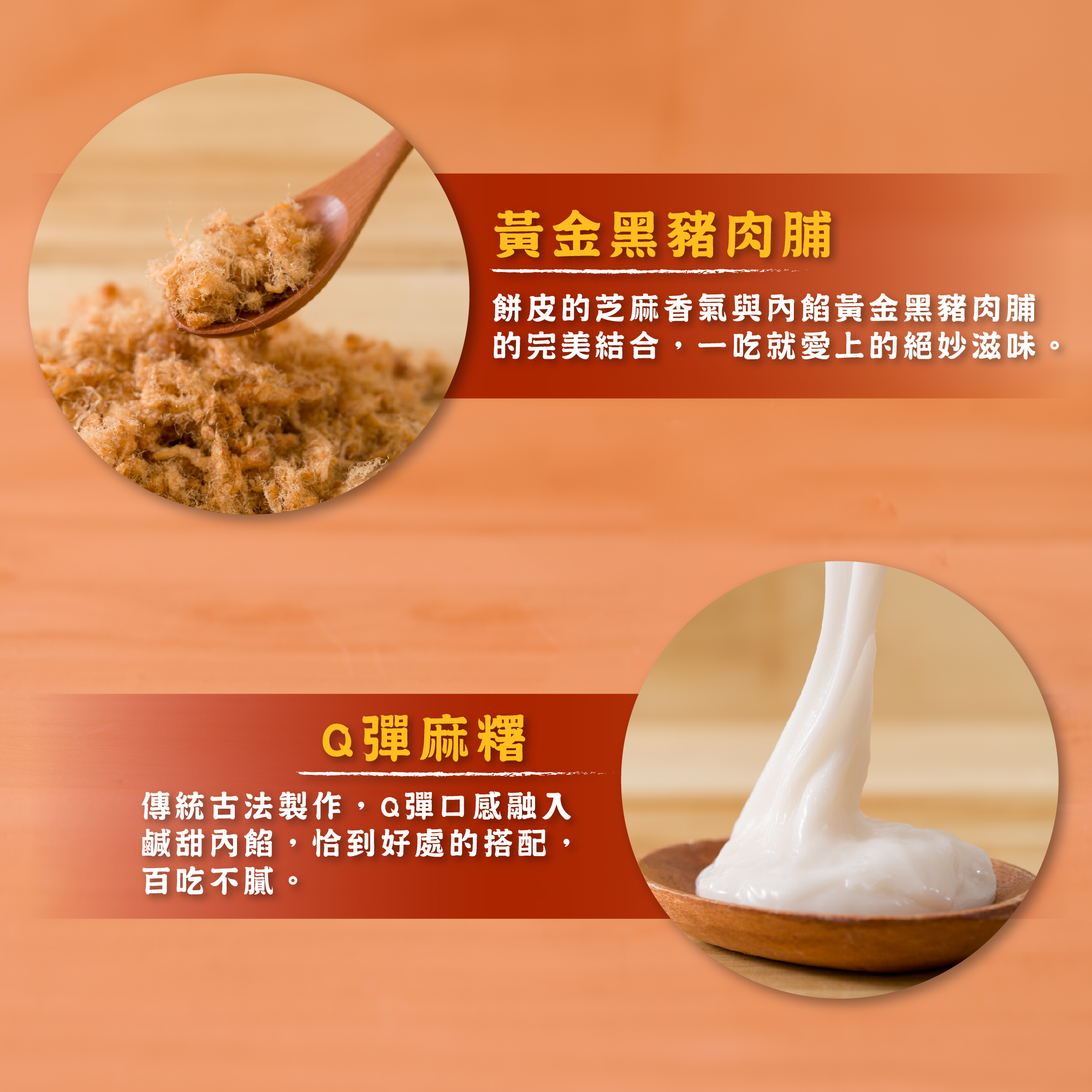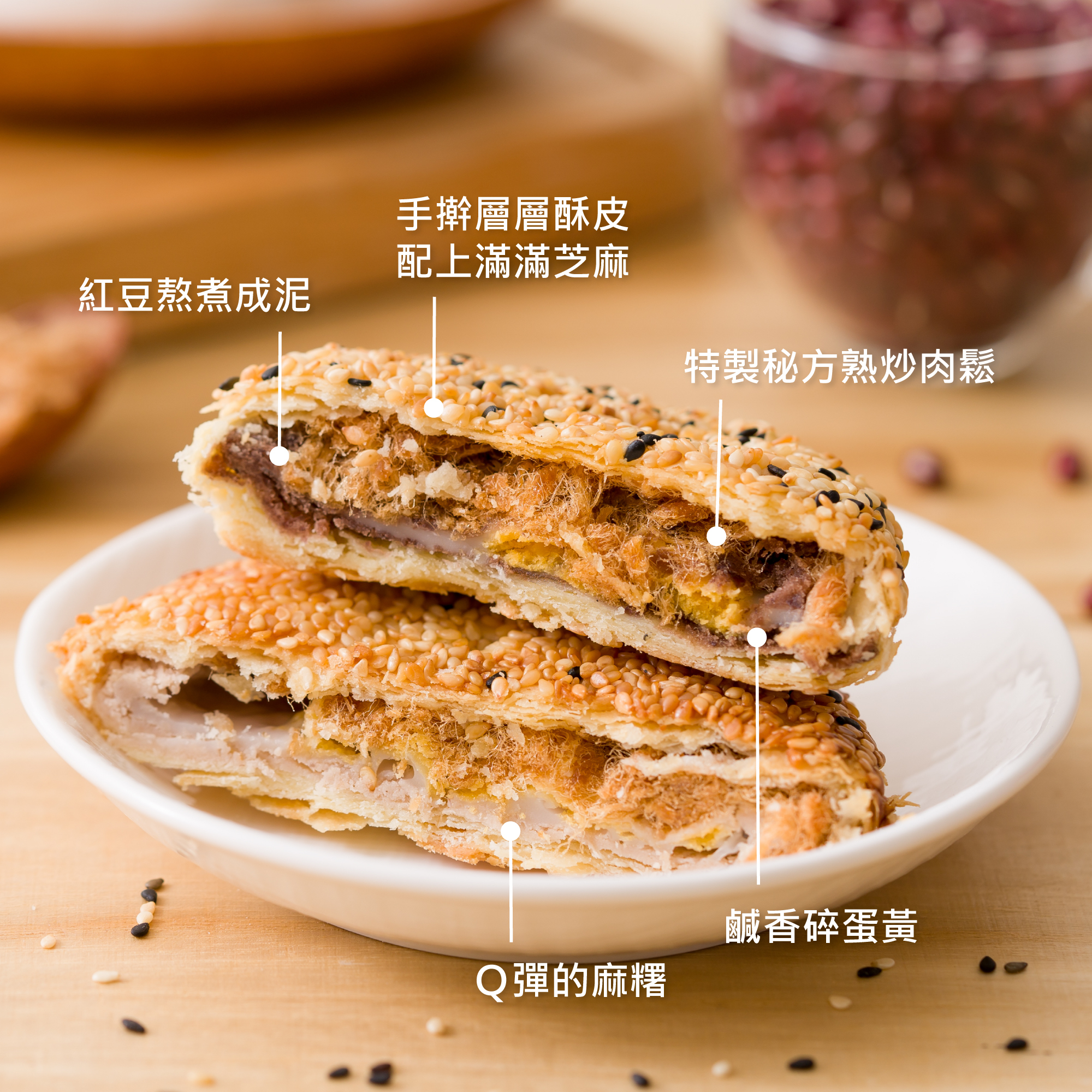 香酥芝麻餅皮,包裹台灣紅豆、黑豬肉肉脯、Q彈麻糬與特級鴨蛋