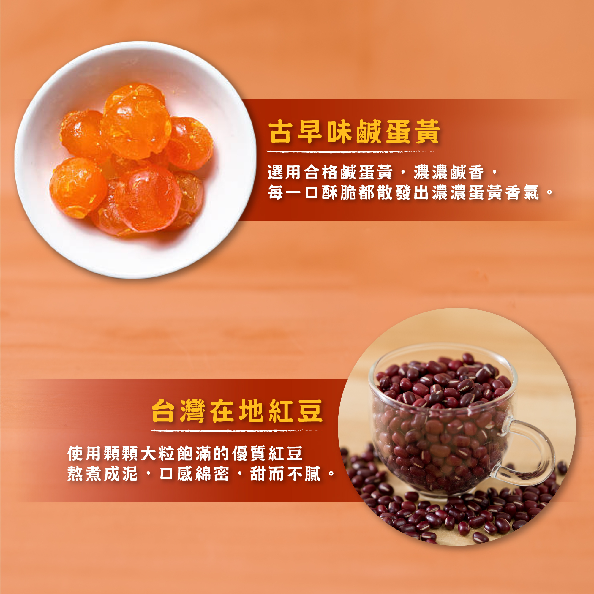 麵粉、紅豆餡(紅豆粒、砂糖、麥芽糖、鹽、奶油)、麻糬【甜味劑(D-山梨醇液70%)、蔗糖、麥芽糖、羥丙基磷酸二澱粉、海藻糖、羥丙基澱粉、著色劑(二氧化鈦)、乳化劑(脂肪酸甘油酯)】、豬肉脯【豬肉、糖、鹽、味精、醬油(大豆、小麥、鹽、砂糖)】、鹹蛋黃(蛋黃、鹽)、維佳無水烘焙油脂【植物性油脂(軟質棕油、硬質棕油、椰子油、大豆油、完全氫化硬質棕油)、奶油、味醂(果糖、水、糯米、米麴、糖、釀造酢、鹽、調味劑(胺基乙酸、檸檬酸鈉、DL-胺基丙酸、5'-次黃嘌呤核甘磷酸二鈉、5'-鳥嘌呤核甘磷酸二鈉))、天然香料、乳化劑(脂肪酸甘油酯)、複方香料(中鏈三酸甘油酯、香料、奶油、葵花油、棕櫚油、食用酒精、抗氧化劑(維生素E))、抗氧化劑(L-抗壞血酸棕櫚酸酯)、著色劑(軟質棕油、葵花油、ß-胡蘿蔔素、抗氧化劑(維生素E))】、砂糖、白芝麻、黑芝麻、大豆沙拉油、糯米粉。