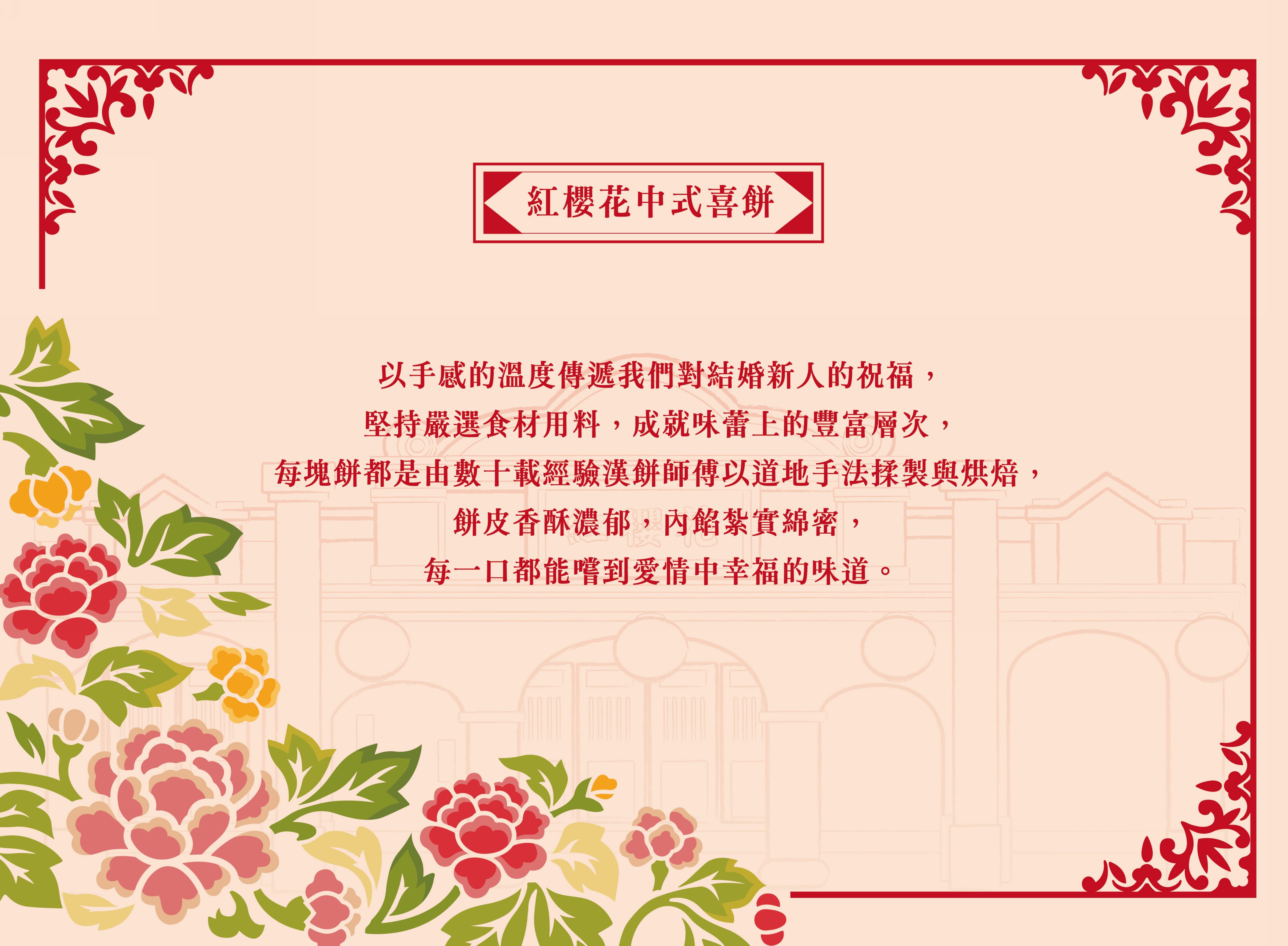 紅櫻花傳統龍鳳喜餅系列,以龍鳳呈祥成雙成對意念作為設計元素,不只保留了傳統也符合了時下潮流。紅櫻花傳統大餅中式喜餅傳承自阿嬤純樸實在的糕餅手藝,採手工現做,鬆軟香甜的餅皮搭配甜度適中的內餡,打造甜而不膩的台灣糕餅的新食感。歡迎來紅櫻花試吃品嚐喜餅,快點選下方圖片,讓紅櫻花陪你一起迎接人生中最喜悅的時刻。